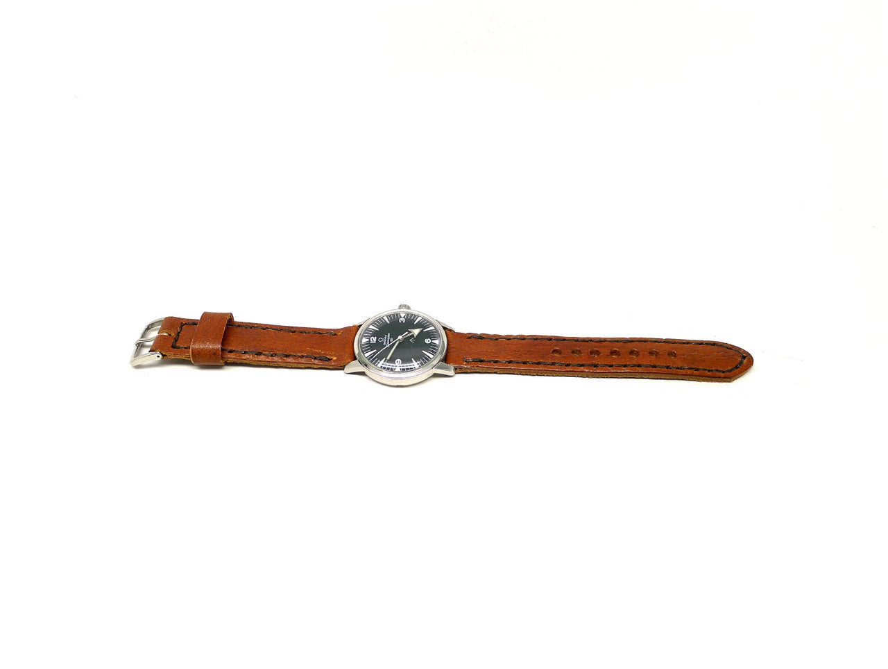• Description: This one of a kind, individually named watch strap is handmade from some of the rarest and most sought-after vintage Swiss ammunition pouches available, that date back from the early 1900s to the late 1960s. We pair this ultra-tough military grade leather with a finely finished stainless steel buckle to create an exceptional quality watch strap that is guaranteed to enhance your watch as well as be a statement piece for your wrist. Every nuanced detail, hole, crease mark, scratch, stitching line or stamp is purposefully presented as each watch strap is truly a one of a kind limited edition masterpiece. We hand stitch every strap using the strongest wax linen thread for added durability, use precise finishing techniques and give meticulous attention to detail so each strap is built to last using only the finest materials available. Enhance your watch with this luxurious handmade vintage leather watch strap, it will give years of all-day comfort and style.