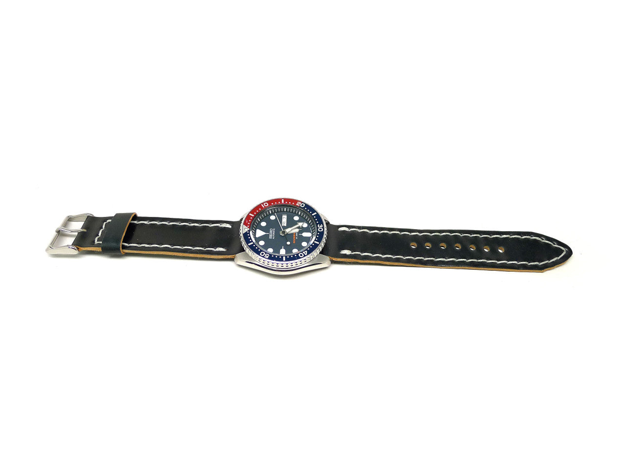 • Description: This one of a kind, individually named watch strap is handmade from genuine Black Horween Shell Cordovan leather and is paired with a finely finished stainless steel buckle, that is guaranteed to enhance your watch. Shell Cordovan is the art of tanning at its finest, taking irregular oval shaped shells and tanning, stuffing, shaving, then polishing – a process taking at least six months to complete at the world famous Horween tannery in Chicago, IL. This intense process gives the leather its unique properties that make it like no other. The results yield some of the finest leather known to man. You simply cannot find better leather! That same care, quality and attention to detail is clear throughout each strap as we mirror their attention to detail in each watch strap we produce. We hand stitch every strap using the strongest wax linen thread for added durability, use precise finishing techniques and give meticulous attention to detail so each strap is built to last using only the finest materials available. Enhance your watch with this luxurious shell cordovan leather watch strap, it will give years of all-day comfort and style.