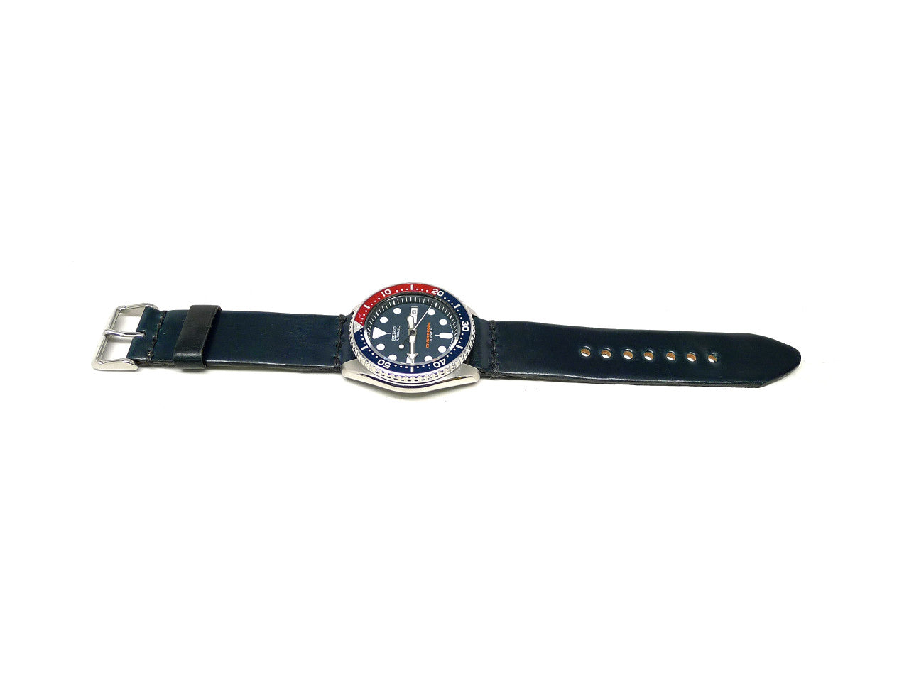 • Description: This one of a kind, individually named watch strap is handmade from genuine Navy Horween Shell Cordovan leather and is paired with a finely finished stainless steel buckle, that is guaranteed to enhance your watch. Shell Cordovan is the art of tanning at its finest, taking irregular oval shaped shells and tanning, stuffing, shaving, then polishing – a process taking at least six months to complete at the world famous Horween tannery in Chicago, IL. This intense process gives the leather its unique properties that make it like no other. The results yield some of the finest leather known to man. You simply cannot find better leather! That same care, quality and attention to detail is clear throughout each strap as we mirror their attention to detail in each watch strap we produce. We hand stitch every strap using the strongest wax linen thread for added durability, use precise finishing techniques and give meticulous attention to detail so each strap is built to last using only the finest materials available. Enhance your watch with this luxurious shell cordovan leather watch strap, it will give years of all-day comfort and style.