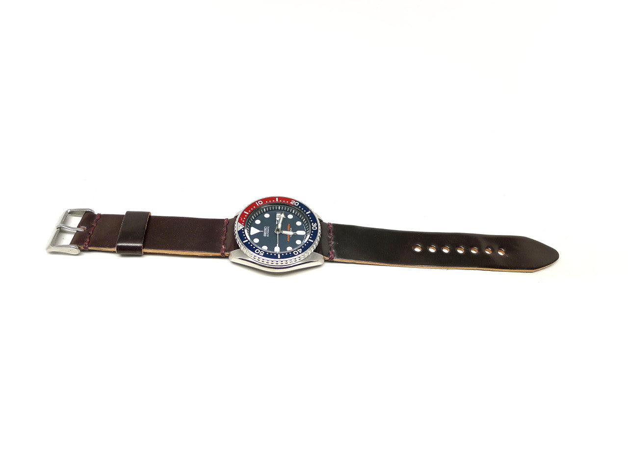 • Description: This one of a kind, individually named watch strap is handmade from genuine Color 8 Horween Shell Cordovan leather and is paired with a finely finished stainless steel buckle, that is guaranteed to enhance your watch. Shell Cordovan is the art of tanning at its finest, taking irregular oval shaped shells and tanning, stuffing, shaving, then polishing – a process taking at least six months to complete at the world famous Horween tannery in Chicago, IL. This intense process gives the leather its unique properties that make it like no other. The results yield some of the finest leather known to man. You simply cannot find better leather! That same care, quality and attention to detail is clear throughout each strap as we mirror their attention to detail in each watch strap we produce. We hand stitch every strap using the strongest wax linen thread for added durability, use precise finishing techniques and give meticulous attention to detail so each strap is built to last using only the finest materials available. Enhance your watch with this luxurious shell cordovan leather watch strap, it will give years of all-day comfort and style.