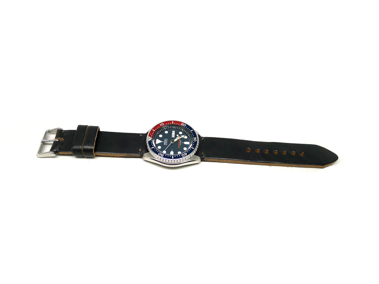 • Description: This one of a kind, individually named watch strap is handmade from some of the finest genuine black Horween Chromexcel leather available and is paired with a finely finished stainless steel buckle, that is guaranteed to enhance your watch. Horween Chromexcel leather is a combination tanned leather that undergoes at least 89 separate processes taking 28 working days to produce at the world famous Horween tannery in Chicago, IL. That same care, quality and attention to detail is clear throughout each strap as we mirror their attention to detail in each watch strap we produce. We hand stitch every strap using the strongest wax linen thread for added durability, use precise finishing techniques and give meticulous attention to detail so each strap is built to last using only the finest materials available. Enhance your watch with this luxurious handmade leather watch strap, it will give years of all-day comfort and style.