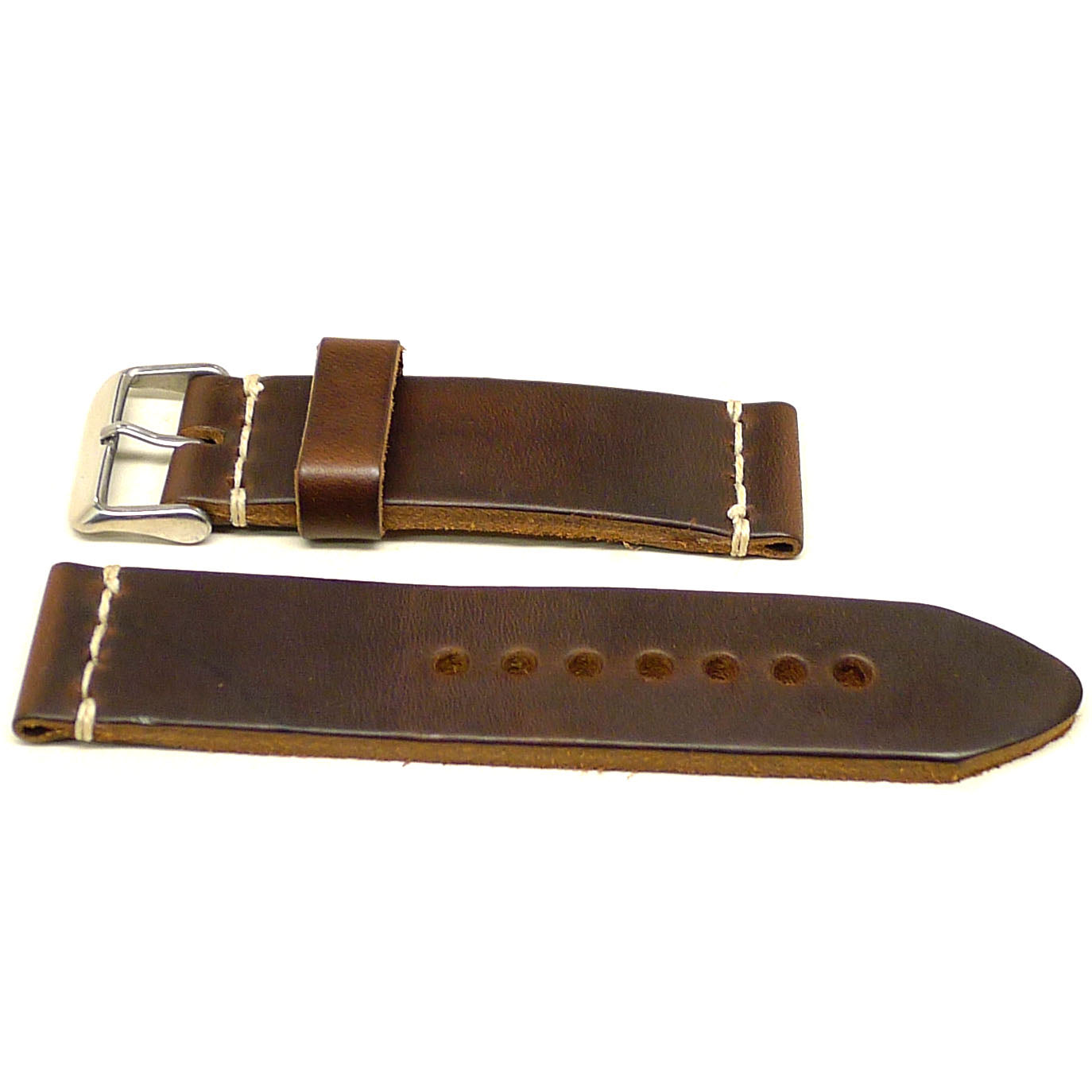 • Description: This one of a kind, individually named watch strap is handmade from some of the finest genuine brown Horween Chromexcel leather available and is paired with a finely finished stainless steel buckle, that is guaranteed to enhance your watch. Horween Chromexcel leather is a combination tanned leather that undergoes at least 89 separate processes taking 28 working days to produce at the world famous Horween tannery in Chicago, IL. That same care, quality and attention to detail is clear throughout each strap as we mirror their attention to detail in each watch strap we produce. We hand stitch every strap using the strongest wax linen thread for added durability, use precise finishing techniques and give meticulous attention to detail so each strap is built to last using only the finest materials available. Enhance your watch with this luxurious handmade leather watch strap, it will give years of all-day comfort and style.
