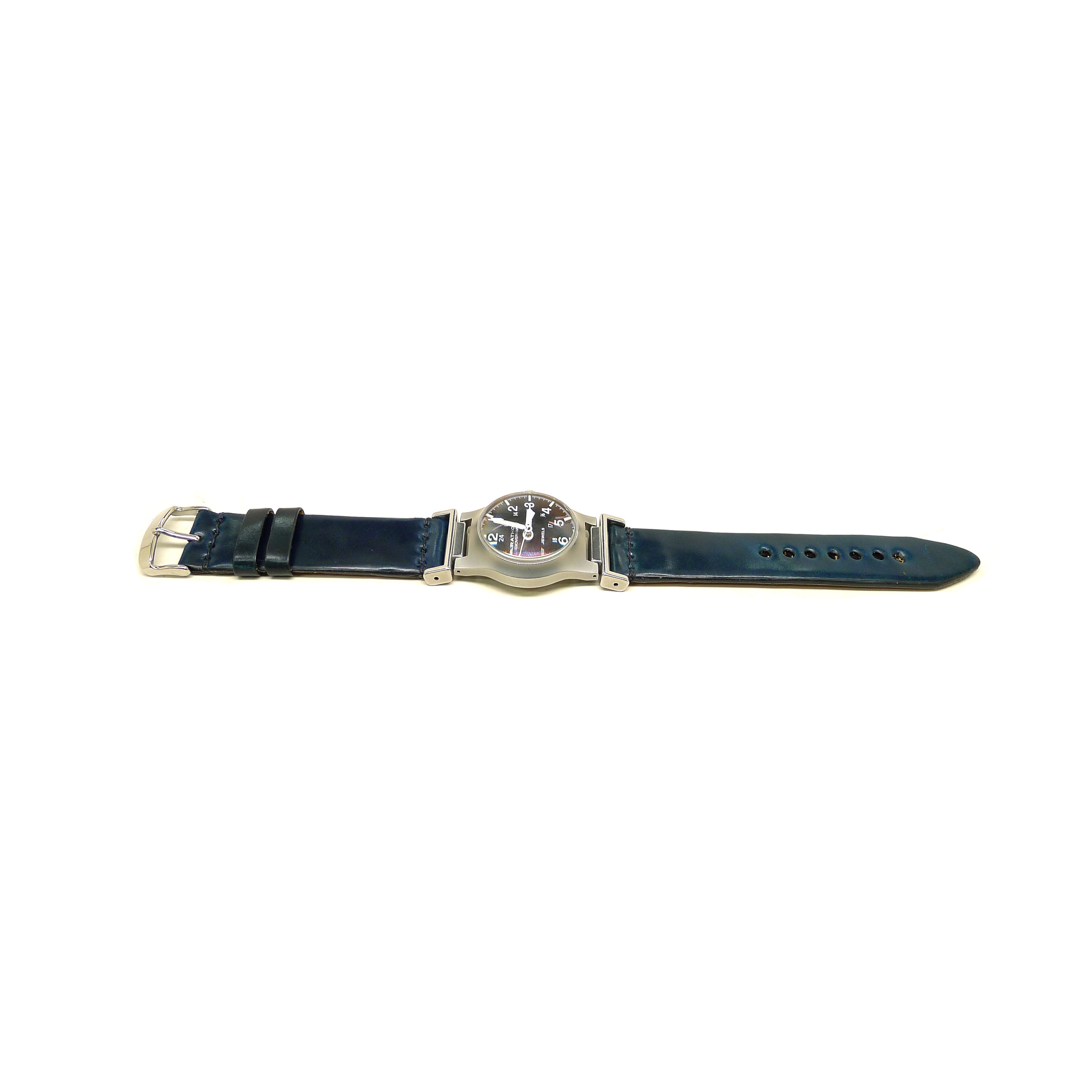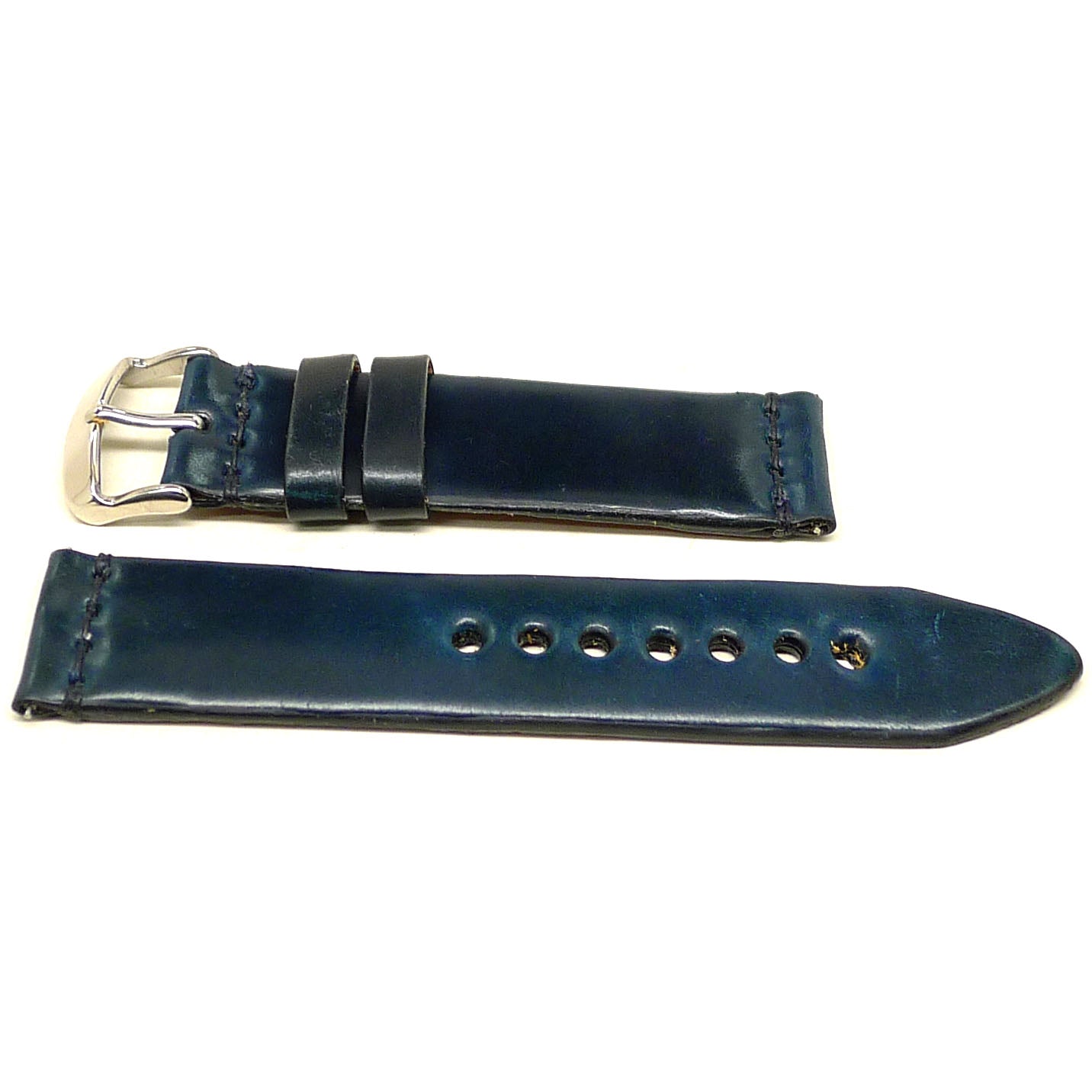 • Description: This one of a kind, individually named watch strap is handmade from genuine Navy Horween Shell Cordovan leather and is paired with a finely finished stainless steel buckle, that is guaranteed to enhance your watch. Shell Cordovan is the art of tanning at its finest, taking irregular oval shaped shells and tanning, stuffing, shaving, then polishing – a process taking at least six months to complete at the world famous Horween tannery in Chicago, IL. This intense process gives the leather its unique properties that make it like no other. The results yield some of the finest leather known to man. You simply cannot find better leather! That same care, quality and attention to detail is clear throughout each strap as we mirror their attention to detail in each watch strap we produce. We hand stitch every strap using the strongest wax linen thread for added durability, use precise finishing techniques and give meticulous attention to detail so each strap is built to last using only the finest materials available. Enhance your watch with this luxurious shell cordovan leather watch strap, it will give years of all-day comfort and style.