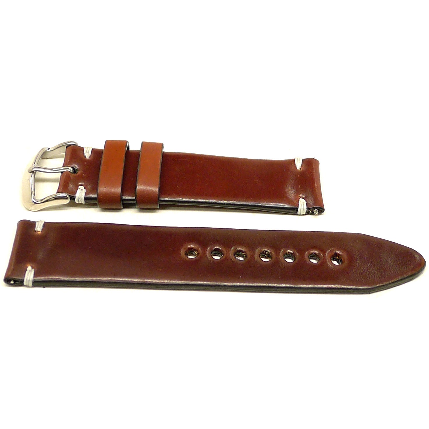 • Description: This one of a kind, individually named watch strap is handmade from genuine Color 4 Horween Shell Cordovan leather and is paired with a finely finished stainless steel buckle, that is guaranteed to enhance your watch. Shell Cordovan is the art of tanning at its finest, taking irregular oval shaped shells and tanning, stuffing, shaving, then polishing – a process taking at least six months to complete at the world famous Horween tannery in Chicago, IL. This intense process gives the leather its unique properties that make it like no other. The results yield some of the finest leather known to man. You simply cannot find better leather! That same care, quality and attention to detail is clear throughout each strap as we mirror their attention to detail in each watch strap we produce. We hand stitch every strap using the strongest wax linen thread for added durability, use precise finishing techniques and give meticulous attention to detail so each strap is built to last using only the finest materials available. Enhance your watch with this luxurious shell cordovan leather watch strap, it will give years of all-day comfort and style.