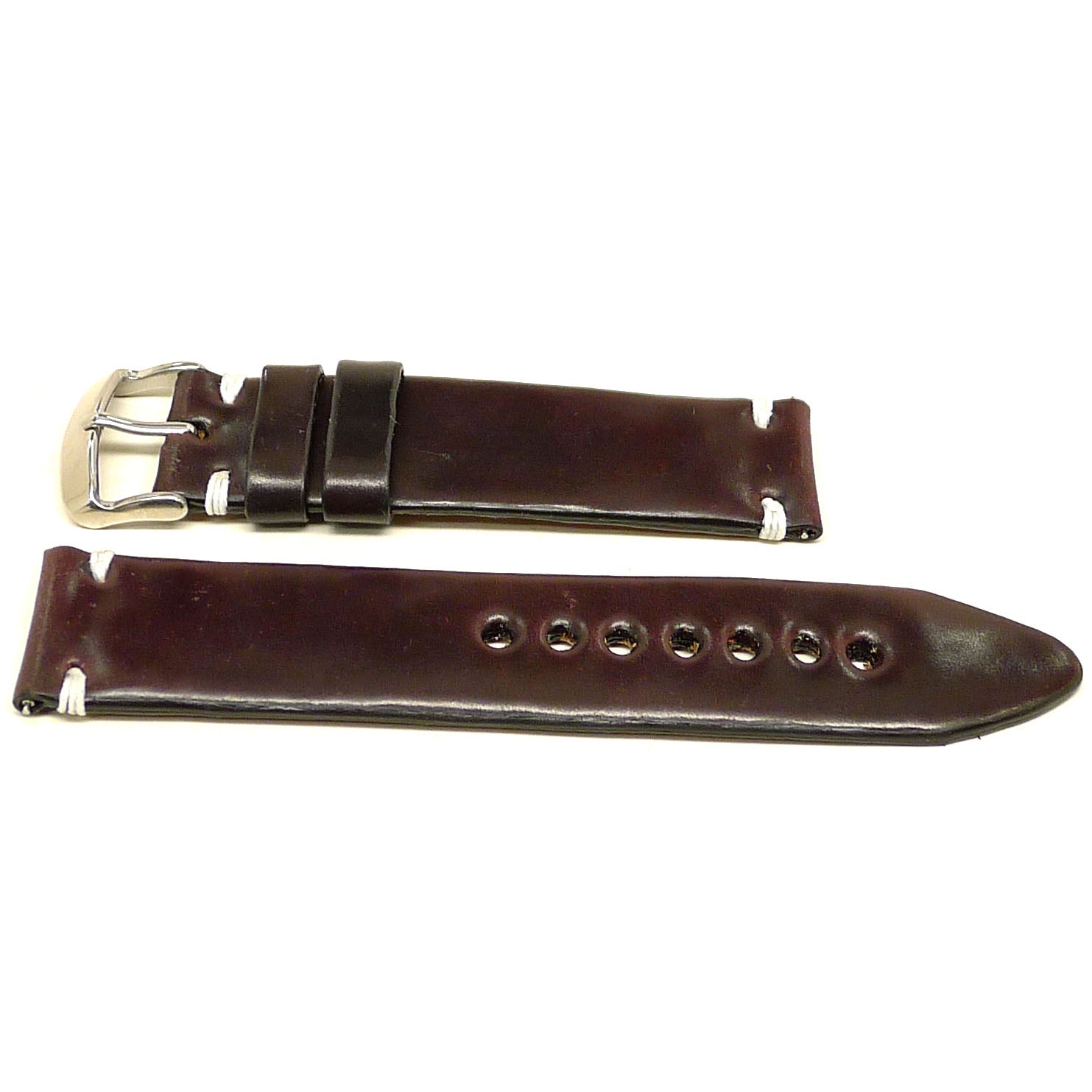 • Description: This one of a kind, individually named watch strap is handmade from genuine Color 8 Horween Shell Cordovan leather and is paired with a finely finished stainless steel buckle, that is guaranteed to enhance your watch. Shell Cordovan is the art of tanning at its finest, taking irregular oval shaped shells and tanning, stuffing, shaving, then polishing – a process taking at least six months to complete at the world famous Horween tannery in Chicago, IL. This intense process gives the leather its unique properties that make it like no other. The results yield some of the finest leather known to man. You simply cannot find better leather! That same care, quality and attention to detail is clear throughout each strap as we mirror their attention to detail in each watch strap we produce. We hand stitch every strap using the strongest wax linen thread for added durability, use precise finishing techniques and give meticulous attention to detail so each strap is built to last using only the finest materials available. Enhance your watch with this luxurious shell cordovan leather watch strap, it will give years of all-day comfort and style.