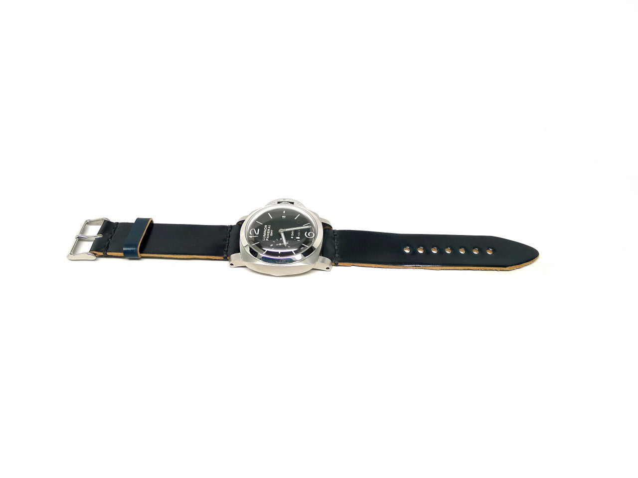• Description: This one of a kind, individually named watch strap is handmade from genuine Navy Horween Shell Cordovan leather and is paired with a finely finished stainless steel buckle, that is guaranteed to enhance your watch. Shell Cordovan is the art of tanning at its finest, taking irregular oval shaped shells and tanning, stuffing, shaving, then polishing – a process taking at least six months to complete at the world famous Horween tannery in Chicago, IL. This intense process gives the leather its unique properties that make it like no other. The results yield some of the finest leather known to man. You simply cannot find better leather! That same care, quality and attention to detail is clear throughout each strap as we mirror their attention to detail in each watch strap we produce. We hand stitch every strap using the strongest wax linen thread for added durability, use precise finishing techniques and give meticulous attention to detail so each strap is built to last using only the finest materials available. Enhance your watch with this luxurious shell cordovan leather watch strap, it will give years of all-day comfort and style.