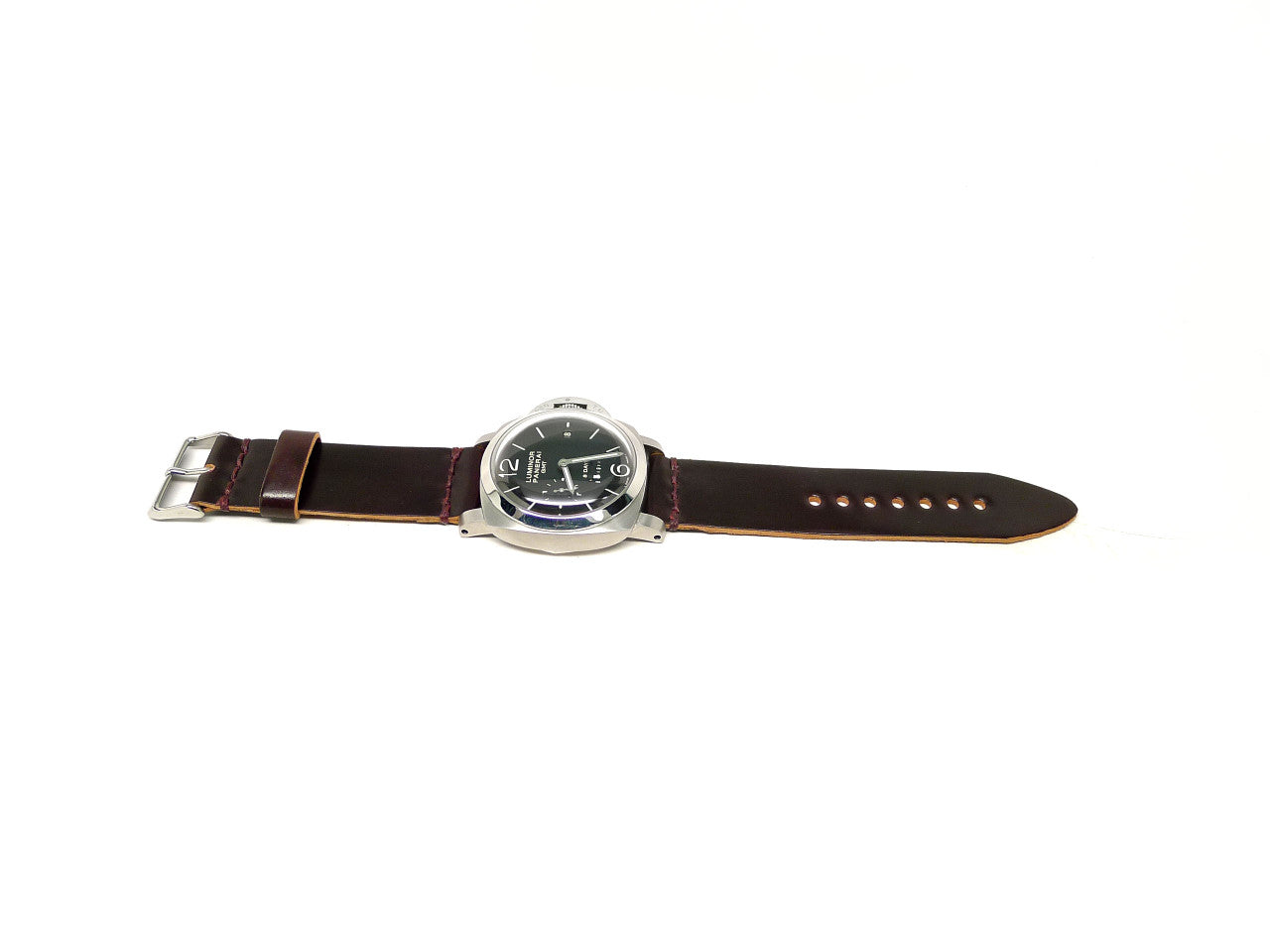 • Description: This one of a kind, individually named watch strap is handmade from genuine Color 8 Horween Shell Cordovan leather and is paired with a finely finished stainless steel buckle, that is guaranteed to enhance your watch. Shell Cordovan is the art of tanning at its finest, taking irregular oval shaped shells and tanning, stuffing, shaving, then polishing – a process taking at least six months to complete at the world famous Horween tannery in Chicago, IL. This intense process gives the leather its unique properties that make it like no other. The results yield some of the finest leather known to man. You simply cannot find better leather! That same care, quality and attention to detail is clear throughout each strap as we mirror their attention to detail in each watch strap we produce. We hand stitch every strap using the strongest wax linen thread for added durability, use precise finishing techniques and give meticulous attention to detail so each strap is built to last using only the finest materials available. Enhance your watch with this luxurious shell cordovan leather watch strap, it will give years of all-day comfort and style.