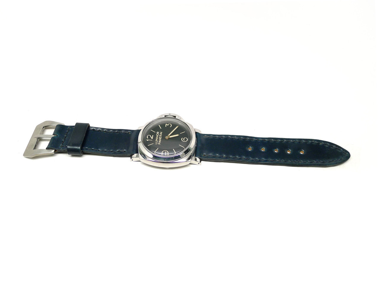 • Description: This one of a kind, individually named watch strap is handmade from genuine Navy Horween Shell Cordovan leather and is paired with a finely finished stainless steel buckle, that is guaranteed to enhance your watch. Shell Cordovan is the art of tanning at its finest, taking irregular oval shaped shells and tanning, stuffing, shaving, then polishing – a process taking at least six months to complete at the world famous Horween tannery in Chicago, IL. This intense process gives the leather its unique properties that make it like no other. The results yield some of the finest leather known to man. You simply cannot find better leather! That same care, quality and attention to detail is clear throughout each strap as we mirror their attention to detail in each watch strap we produce. We hand stitch every strap using the strongest wax linen thread for added durability, use precise finishing techniques and give meticulous attention to detail so each strap is built to last using only the finest materials available. Enhance your watch with this luxurious shell cordovan leather watch strap, it will give years of all-day comfort and style.