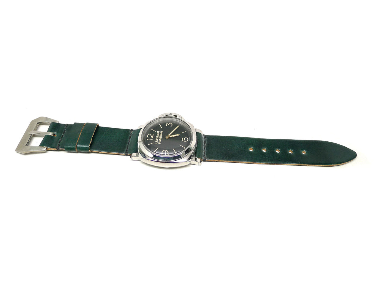 • Description: This one of a kind, individually named watch strap is handmade from genuine Green Horween Shell Cordovan leather and is paired with a finely finished stainless steel buckle, that is guaranteed to enhance your watch. Shell Cordovan is the art of tanning at its finest, taking irregular oval shaped shells and tanning, stuffing, shaving, then polishing – a process taking at least six months to complete at the world famous Horween tannery in Chicago, IL. This intense process gives the leather its unique properties that make it like no other. The results yield some of the finest leather known to man. You simply cannot find better leather! That same care, quality and attention to detail is clear throughout each strap as we mirror their attention to detail in each watch strap we produce. We hand stitch every strap using the strongest wax linen thread for added durability, use precise finishing techniques and give meticulous attention to detail so each strap is built to last using only the finest materials available. Enhance your watch with this luxurious shell cordovan leather watch strap, it will give years of all-day comfort and style.