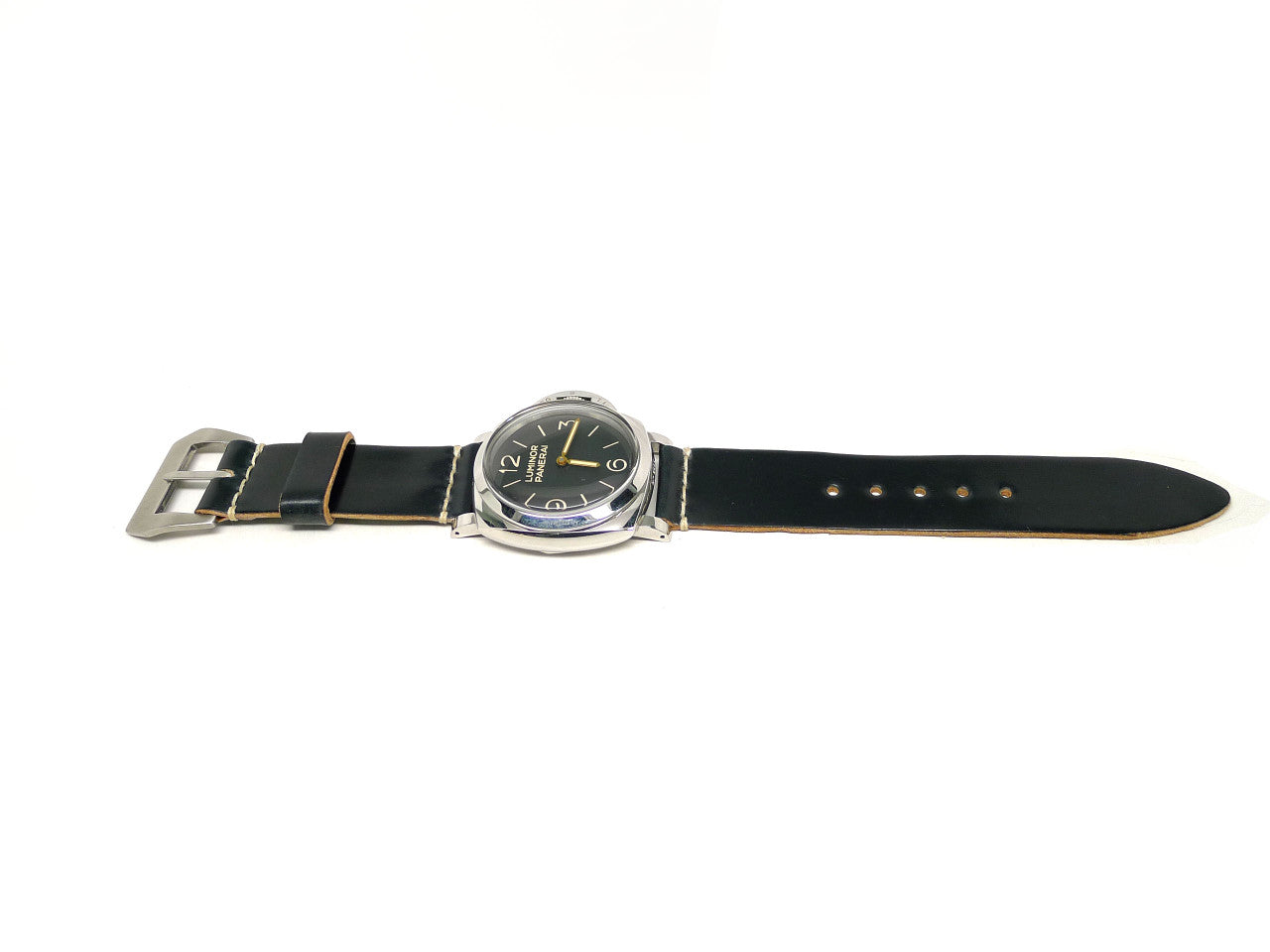 • Description: This one of a kind, individually named watch strap is handmade from genuine Black Horween Shell Cordovan leather and is paired with a finely finished stainless steel buckle, that is guaranteed to enhance your watch. Shell Cordovan is the art of tanning at its finest, taking irregular oval shaped shells and tanning, stuffing, shaving, then polishing – a process taking at least six months to complete at the world famous Horween tannery in Chicago, IL. This intense process gives the leather its unique properties that make it like no other. The results yield some of the finest leather known to man. You simply cannot find better leather! That same care, quality and attention to detail is clear throughout each strap as we mirror their attention to detail in each watch strap we produce. We hand stitch every strap using the strongest wax linen thread for added durability, use precise finishing techniques and give meticulous attention to detail so each strap is built to last using only the finest materials available. Enhance your watch with this luxurious shell cordovan leather watch strap, it will give years of all-day comfort and style.