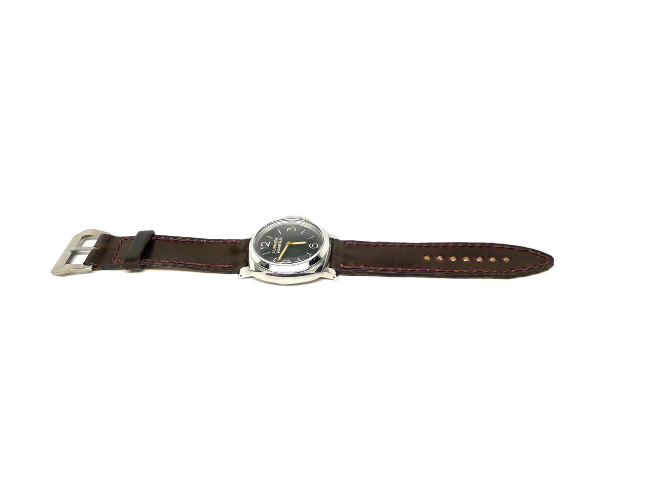 • Description: This one of a kind, individually named watch strap is handmade from genuine Color 8 Horween Shell Cordovan leather and is paired with a finely finished stainless steel buckle, that is guaranteed to enhance your watch. Shell Cordovan is the art of tanning at its finest, taking irregular oval shaped shells and tanning, stuffing, shaving, then polishing – a process taking at least six months to complete at the world famous Horween tannery in Chicago, IL. This intense process gives the leather its unique properties that make it like no other. The results yield some of the finest leather known to man. You simply cannot find better leather! That same care, quality and attention to detail is clear throughout each strap as we mirror their attention to detail in each watch strap we produce. We hand stitch every strap using the strongest wax linen thread for added durability, use precise finishing techniques and give meticulous attention to detail so each strap is built to last using only the finest materials available. Enhance your watch with this luxurious shell cordovan leather watch strap, it will give years of all-day comfort and style.
