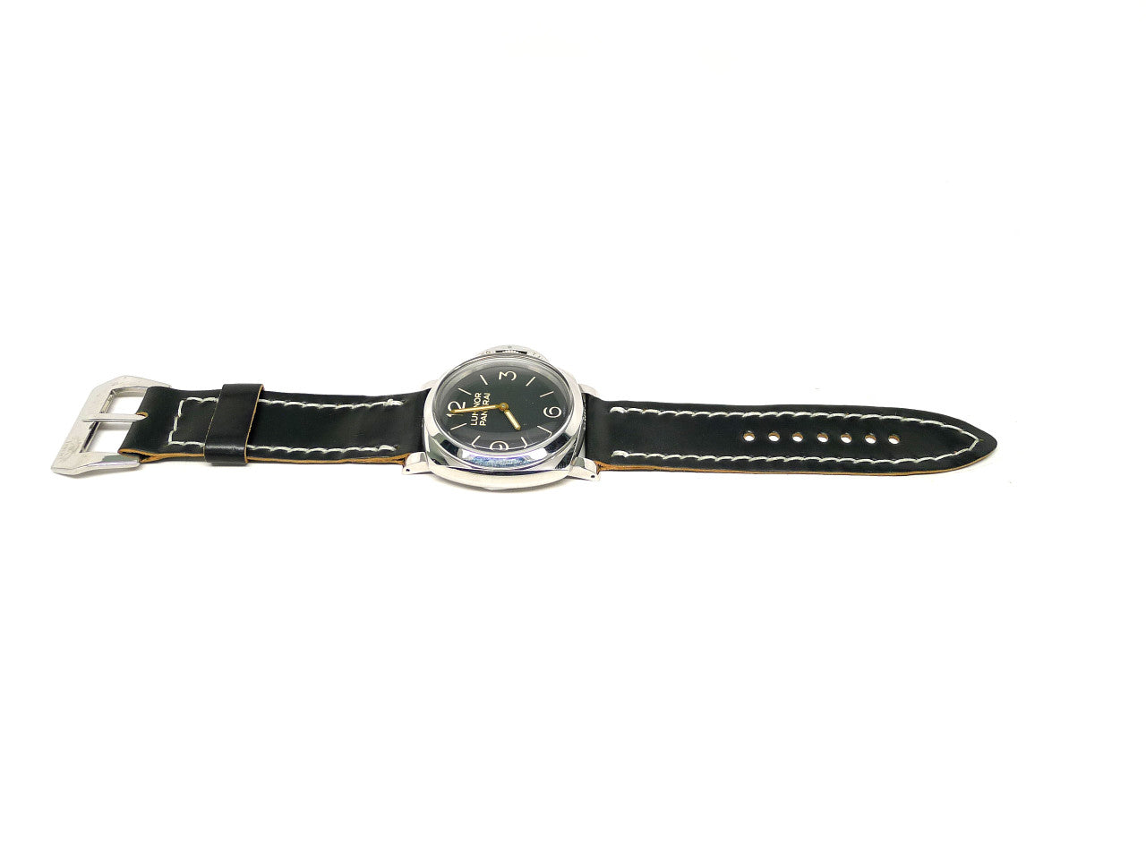 • Description: This one of a kind, individually named watch strap is handmade from genuine Black Horween Shell Cordovan leather and is paired with a finely finished stainless steel buckle, that is guaranteed to enhance your watch. Shell Cordovan is the art of tanning at its finest, taking irregular oval shaped shells and tanning, stuffing, shaving, then polishing – a process taking at least six months to complete at the world famous Horween tannery in Chicago, IL. This intense process gives the leather its unique properties that make it like no other. The results yield some of the finest leather known to man. You simply cannot find better leather! That same care, quality and attention to detail is clear throughout each strap as we mirror their attention to detail in each watch strap we produce. We hand stitch every strap using the strongest wax linen thread for added durability, use precise finishing techniques and give meticulous attention to detail so each strap is built to last using only the finest materials available. Enhance your watch with this luxurious shell cordovan leather watch strap, it will give years of all-day comfort and style.