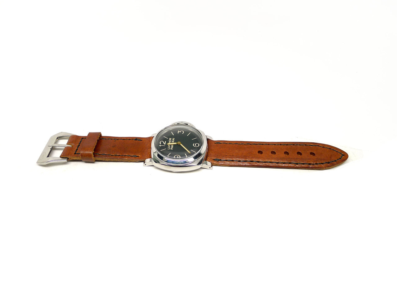 • Description: This one of a kind, individually named watch strap is handmade from some of the rarest and most sought-after vintage Swiss ammunition pouches available, that date back from the early 1900s to the late 1960s. We pair this ultra-tough military grade leather with a finely finished stainless steel buckle to create an exceptional quality watch strap that is guaranteed to enhance your watch as well as be a statement piece for your wrist. Every nuanced detail, hole, crease mark, scratch, stitching line or stamp is purposefully presented as each watch strap is truly a one of a kind limited edition masterpiece. We hand stitch every strap using the strongest wax linen thread for added durability, use precise finishing techniques and give meticulous attention to detail so each strap is built to last using only the finest materials available. Enhance your watch with this luxurious handmade vintage leather watch strap, it will give years of all-day comfort and style.