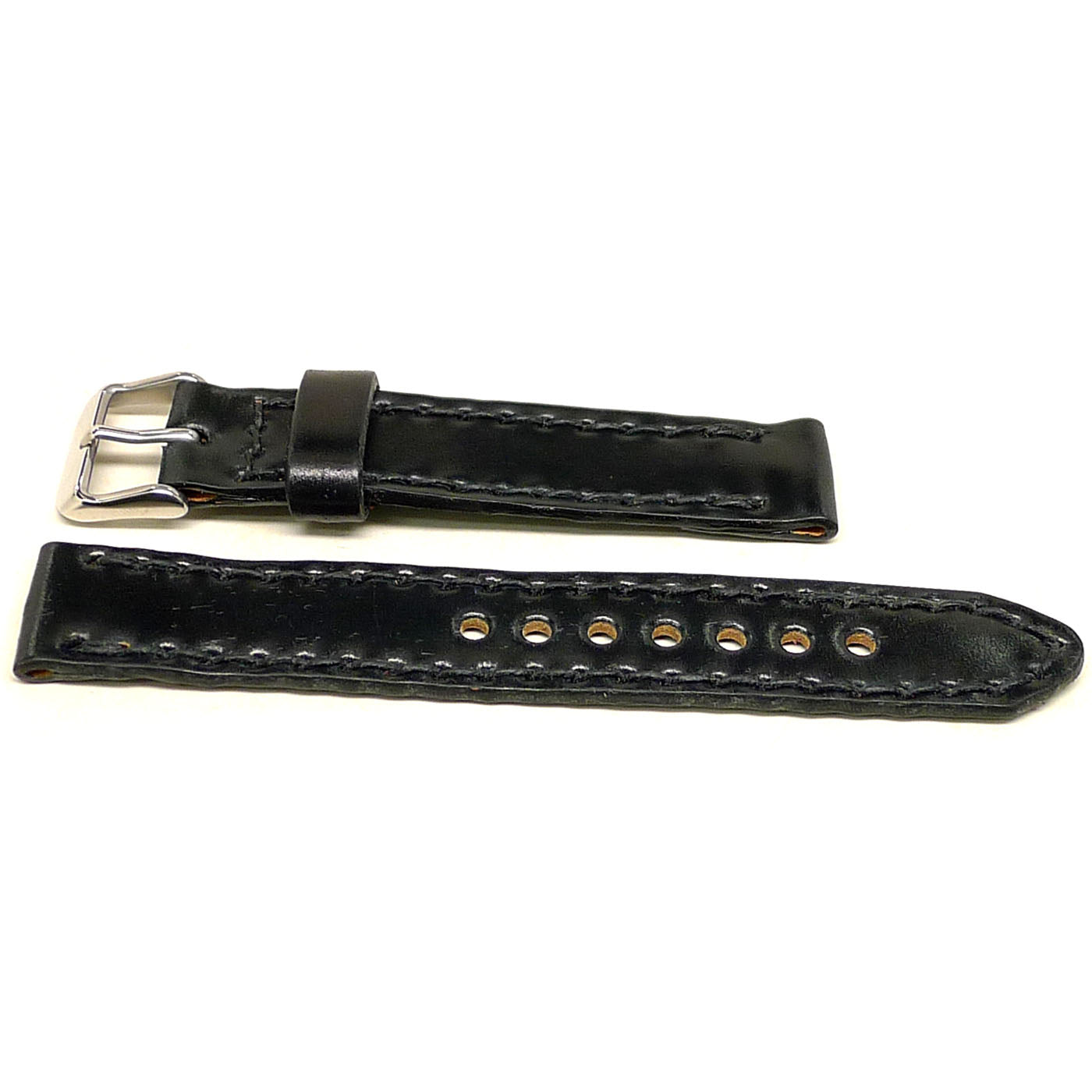• Description: This one of a kind, individually named watch strap is handmade from genuine Black Horween Shell Cordovan leather and is paired with a finely finished stainless steel buckle, that is guaranteed to enhance your watch. Shell Cordovan is the art of tanning at its finest, taking irregular oval shaped shells and tanning, stuffing, shaving, then polishing – a process taking at least six months to complete at the world famous Horween tannery in Chicago, IL. This intense process gives the leather its unique properties that make it like no other. The results yield some of the finest leather known to man. You simply cannot find better leather! That same care, quality and attention to detail is clear throughout each strap as we mirror their attention to detail in each watch strap we produce. We hand stitch every strap using the strongest wax linen thread for added durability, use precise finishing techniques and give meticulous attention to detail so each strap is built to last using only the finest materials available. Enhance your watch with this luxurious shell cordovan leather watch strap, it will give years of all-day comfort and style.