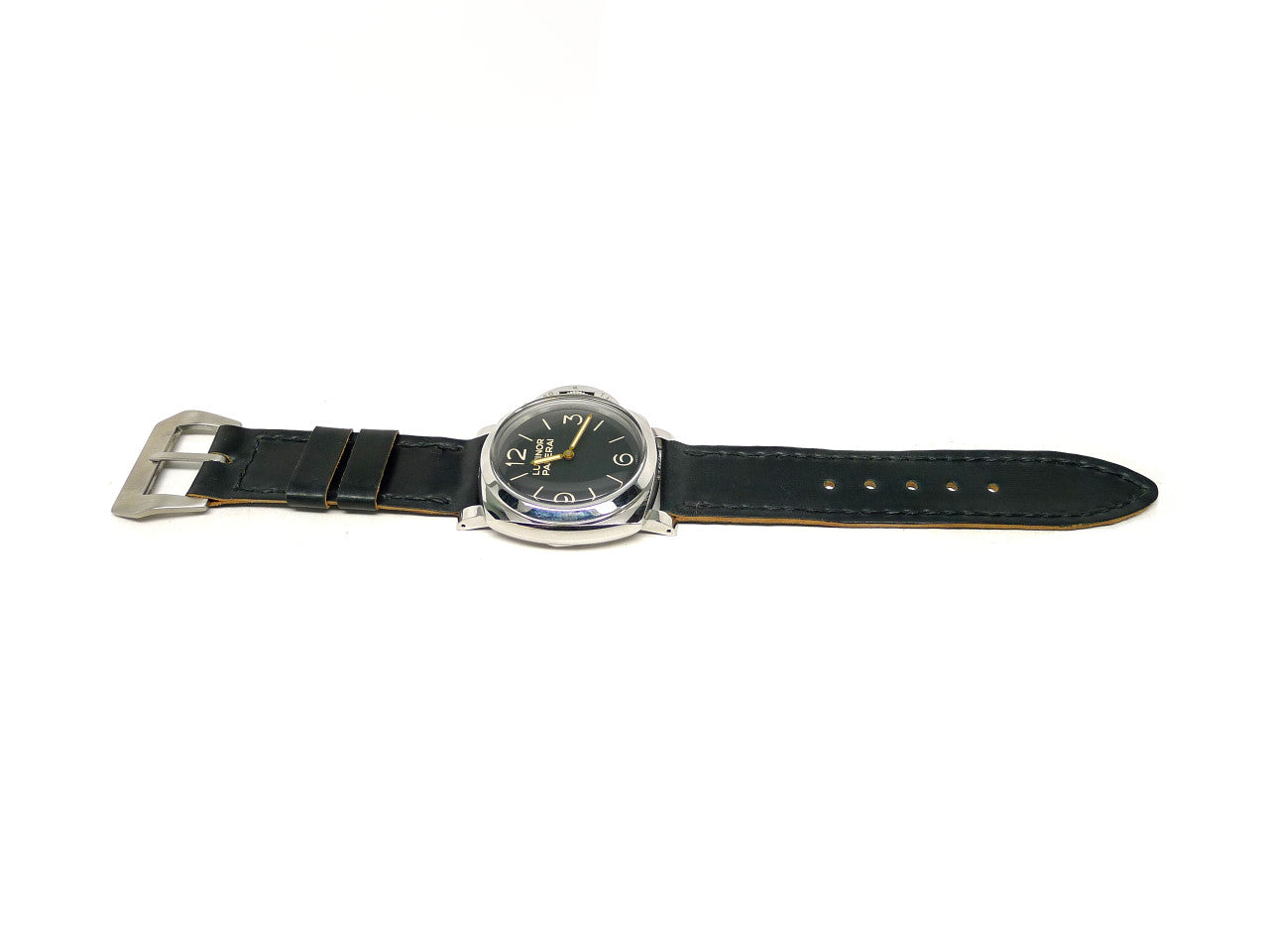 • Description: This one of a kind, individually named watch strap is handmade from genuine Black Horween Shell Cordovan leather and is paired with a finely finished stainless steel buckle, that is guaranteed to enhance your watch. Shell Cordovan is the art of tanning at its finest, taking irregular oval shaped shells and tanning, stuffing, shaving, then polishing – a process taking at least six months to complete at the world famous Horween tannery in Chicago, IL. This intense process gives the leather its unique properties that make it like no other. The results yield some of the finest leather known to man. You simply cannot find better leather! That same care, quality and attention to detail is clear throughout each strap as we mirror their attention to detail in each watch strap we produce. We hand stitch every strap using the strongest wax linen thread for added durability, use precise finishing techniques and give meticulous attention to detail so each strap is built to last using only the finest materials available. Enhance your watch with this luxurious shell cordovan leather watch strap, it will give years of all-day comfort and style.