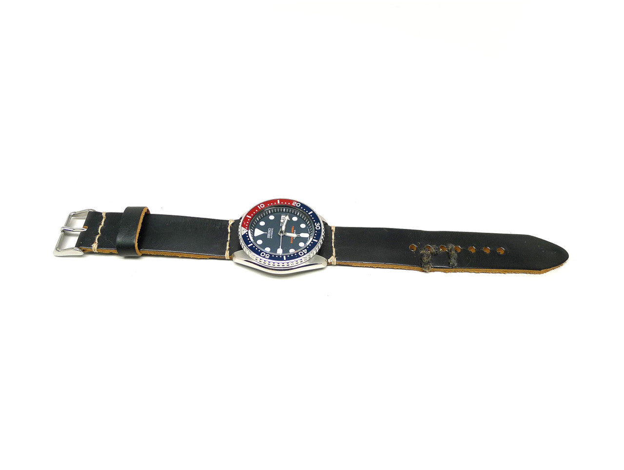 • Description: This one of a kind, individually named watch strap is handmade from some of the rarest and most sought-after vintage French ammunition pouches available, that date back to the 1960s. We pair this ultra-tough military grade leather with a finely finished stainless steel buckle to create an exceptional quality watch strap that is guaranteed to enhance your watch as well as be a statement piece for your wrist. Every nuanced detail, hole, crease mark, scratch, stitching line or stamp is purposefully presented as each watch strap is truly a one of a kind limited edition masterpiece. We hand stitch every strap using the strongest wax linen thread for added durability, use precise finishing techniques and give meticulous attention to detail so each strap is built to last using only the finest materials available. Enhance your watch with this luxurious handmade vintage leather watch strap, it will give years of all-day comfort and style.