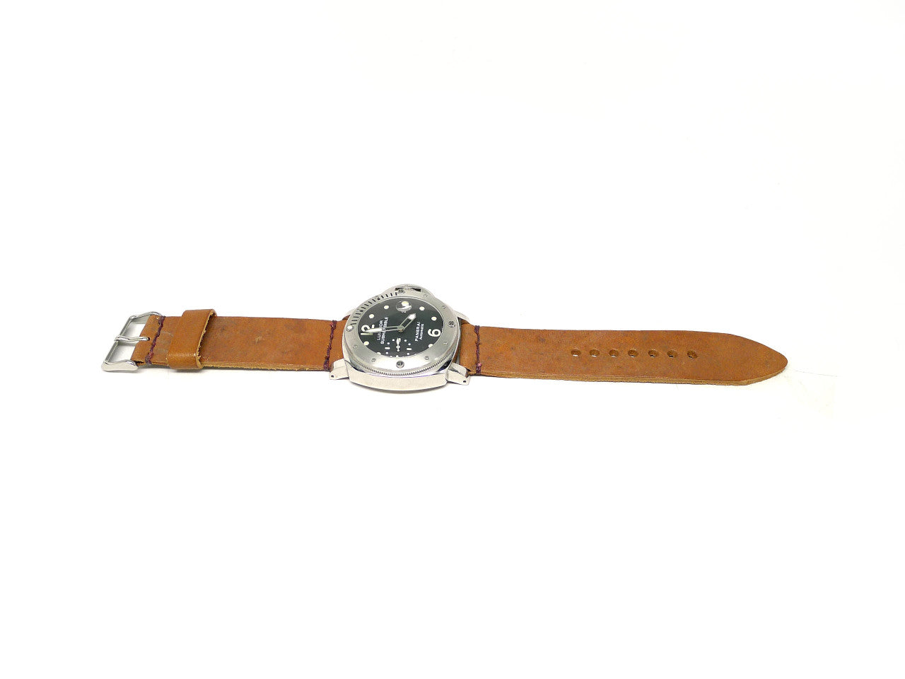 • Description: This one of a kind, individually named watch strap is handmade from some of the rarest and most sought-after vintage French ammunition pouches available, that date back to the 1960s. We pair this ultra-tough military grade leather with a finely finished stainless steel buckle to create an exceptional quality watch strap that is guaranteed to enhance your watch as well as be a statement piece for your wrist. Every nuanced detail, hole, crease mark, scratch, stitching line or stamp is purposefully presented as each watch strap is truly a one of a kind limited edition masterpiece. We hand stitch every strap using the strongest wax linen thread for added durability, use precise finishing techniques and give meticulous attention to detail so each strap is built to last using only the finest materials available. Enhance your watch with this luxurious handmade vintage leather watch strap, it will give years of all-day comfort and style.
