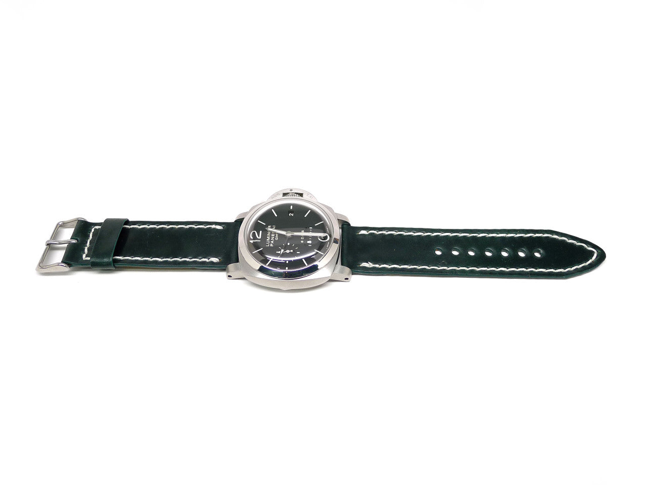 • Description: This one of a kind, individually named watch strap is handmade from genuine Green Horween Shell Cordovan leather and is paired with a finely finished stainless steel buckle, that is guaranteed to enhance your watch. Shell Cordovan is the art of tanning at its finest, taking irregular oval shaped shells and tanning, stuffing, shaving, then polishing – a process taking at least six months to complete at the world famous Horween tannery in Chicago, IL. This intense process gives the leather its unique properties that make it like no other. The results yield some of the finest leather known to man. You simply cannot find better leather! That same care, quality and attention to detail is clear throughout each strap as we mirror their attention to detail in each watch strap we produce. We hand stitch every strap using the strongest wax linen thread for added durability, use precise finishing techniques and give meticulous attention to detail so each strap is built to last using only the finest materials available. Enhance your watch with this luxurious shell cordovan leather watch strap, it will give years of all-day comfort and style.