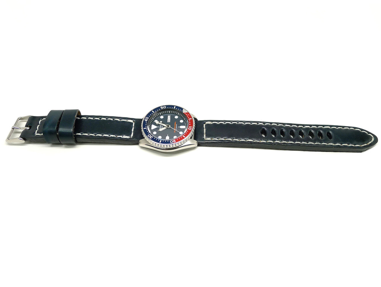 • Description: This one of a kind, individually named ultra thick watch strap is handmade from genuine Navy Horween Shell Cordovan leather and is paired with a finely finished stainless steel buckle, that is guaranteed to enhance your watch. Shell Cordovan is the art of tanning at its finest, taking irregular oval shaped shells and tanning, stuffing, shaving, then polishing – a process taking at least six months to complete at the world famous Horween tannery in Chicago, IL. This intense process gives the leather its unique properties that make it like no other. The results yield some of the finest leather known to man. You simply cannot find better leather! That same care, quality and attention to detail is clear throughout each strap as we mirror their attention to detail in each watch strap we produce. We hand stitch every strap using the strongest wax linen thread for added durability, use precise finishing techniques and give meticulous attention to detail so each strap is built to last using only the finest materials available. Enhance your watch with this luxurious shell cordovan leather watch strap, it will give years of all-day comfort and style.
