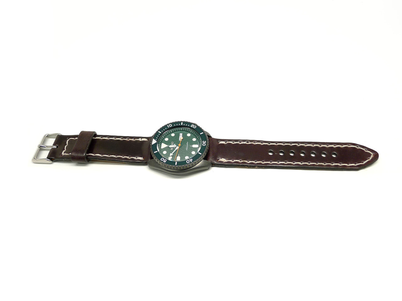 • Description: This one of a kind, individually named watch strap is handmade from genuine Color 8 Horween Shell Cordovan leather and is paired with a finely finished stainless steel buckle, that is guaranteed to enhance your watch. Shell Cordovan is the art of tanning at its finest, taking irregular oval shaped shells and tanning, stuffing, shaving, then polishing – a process taking at least six months to complete at the world famous Horween tannery in Chicago, IL. This intense process gives the leather its unique properties that make it like no other. The results yield some of the finest leather known to man. You simply cannot find better leather! That same care, quality and attention to detail is clear throughout each strap as we mirror their attention to detail in each watch strap we produce. We hand stitch every strap using the strongest wax linen thread for added durability, use precise finishing techniques and give meticulous attention to detail so each strap is built to last using only the finest materials available. Enhance your watch with this luxurious shell cordovan leather watch strap, it will give years of all-day comfort and style.