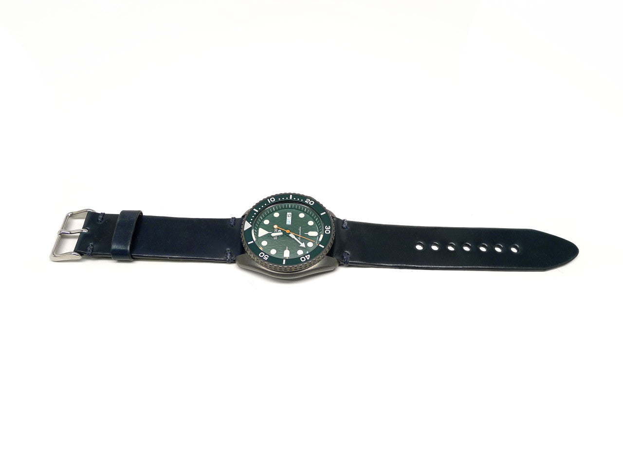 • Description: This one of a kind, individually named watch strap is handmade from genuine Navy Horween Shell Cordovan leather and is paired with a finely finished stainless steel buckle, that is guaranteed to enhance your watch. Shell Cordovan is the art of tanning at its finest, taking irregular oval shaped shells and tanning, stuffing, shaving, then polishing – a process taking at least six months to complete at the world famous Horween tannery in Chicago, IL. This intense process gives the leather its unique properties that make it like no other. The results yield some of the finest leather known to man. You simply cannot find better leather! That same care, quality and attention to detail is clear throughout each strap as we mirror their attention to detail in each watch strap we produce. We hand stitch every strap using the strongest wax linen thread for added durability, use precise finishing techniques and give meticulous attention to detail so each strap is built to last using only the finest materials available. Enhance your watch with this luxurious shell cordovan leather watch strap, it will give years of all-day comfort and style.