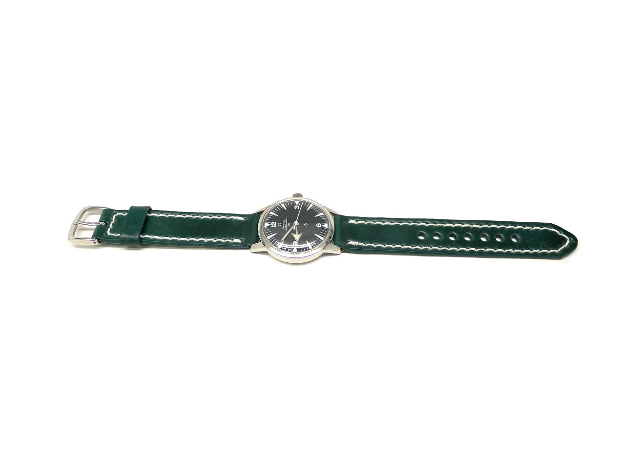 • Description: This one of a kind, individually named watch strap is handmade from genuine Green Horween Shell Cordovan leather and is paired with a finely finished stainless steel buckle, that is guaranteed to enhance your watch. Shell Cordovan is the art of tanning at its finest, taking irregular oval shaped shells and tanning, stuffing, shaving, then polishing – a process taking at least six months to complete at the world famous Horween tannery in Chicago, IL. This intense process gives the leather its unique properties that make it like no other. The results yield some of the finest leather known to man. You simply cannot find better leather! That same care, quality and attention to detail is clear throughout each strap as we mirror their attention to detail in each watch strap we produce. We hand stitch every strap using the strongest wax linen thread for added durability, use precise finishing techniques and give meticulous attention to detail so each strap is built to last using only the finest materials available. Enhance your watch with this luxurious shell cordovan leather watch strap, it will give years of all-day comfort and style.