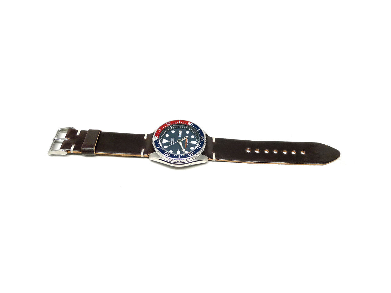• Description: This one of a kind, individually named watch strap is handmade from genuine Color 8 Horween Shell Cordovan leather and is paired with a finely finished stainless steel buckle, that is guaranteed to enhance your watch. Shell Cordovan is the art of tanning at its finest, taking irregular oval shaped shells and tanning, stuffing, shaving, then polishing – a process taking at least six months to complete at the world famous Horween tannery in Chicago, IL. This intense process gives the leather its unique properties that make it like no other. The results yield some of the finest leather known to man. You simply cannot find better leather! That same care, quality and attention to detail is clear throughout each strap as we mirror their attention to detail in each watch strap we produce. We hand stitch every strap using the strongest wax linen thread for added durability, use precise finishing techniques and give meticulous attention to detail so each strap is built to last using only the finest materials available. Enhance your watch with this luxurious shell cordovan leather watch strap, it will give years of all-day comfort and style.