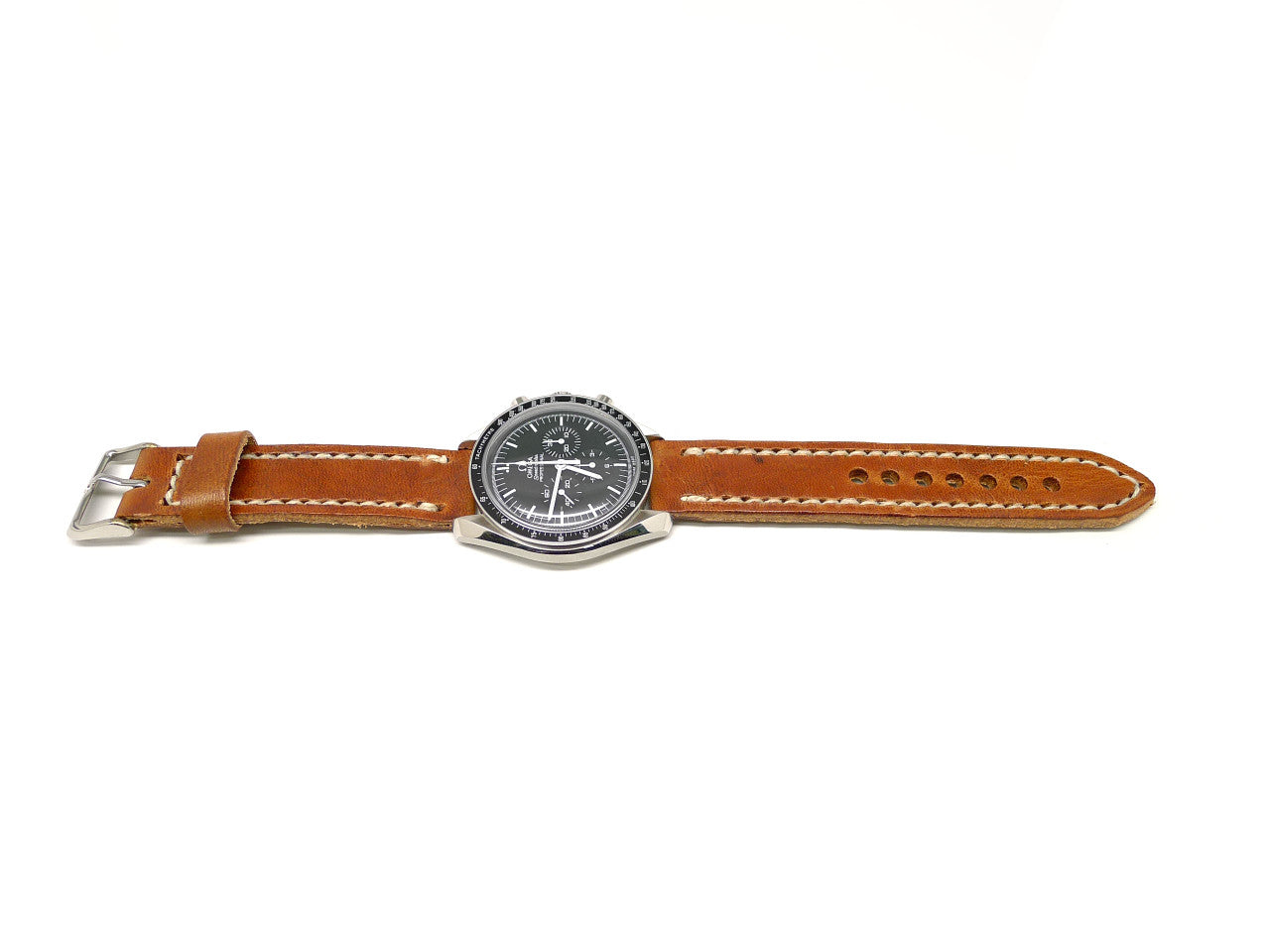 • Description: This one of a kind, individually named watch strap is handmade from some of the rarest and most sought-after vintage Swiss ammunition pouches available, that date back from the early 1900s to the late 1960s. We pair this ultra-tough military grade leather with a finely finished stainless steel buckle to create an exceptional quality watch strap that is guaranteed to enhance your watch as well as be a statement piece for your wrist. Every nuanced detail, hole, crease mark, scratch, stitching line or stamp is purposefully presented as each watch strap is truly a one of a kind limited edition masterpiece. We hand stitch every strap using the strongest wax linen thread for added durability, use precise finishing techniques and give meticulous attention to detail so each strap is built to last using only the finest materials available. Enhance your watch with this luxurious handmade vintage leather watch strap, it will give years of all-day comfort and style.