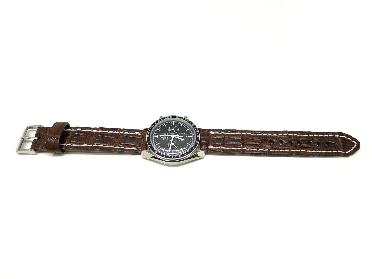 • Description: This one of a kind, individually named watch strap is handmade from some of the finest genuine alligator skins available and is paired with a finely finished stainless steel buckle, that is guaranteed to enhance your watch. We hand stitch every strap using the strongest wax linen thread for added durability, use precise finishing techniques and give meticulous attention to detail so each strap is built to last using only the finest materials available. Enhance your watch with this luxurious handmade alligator watch strap, it will give years of all-day comfort and style.