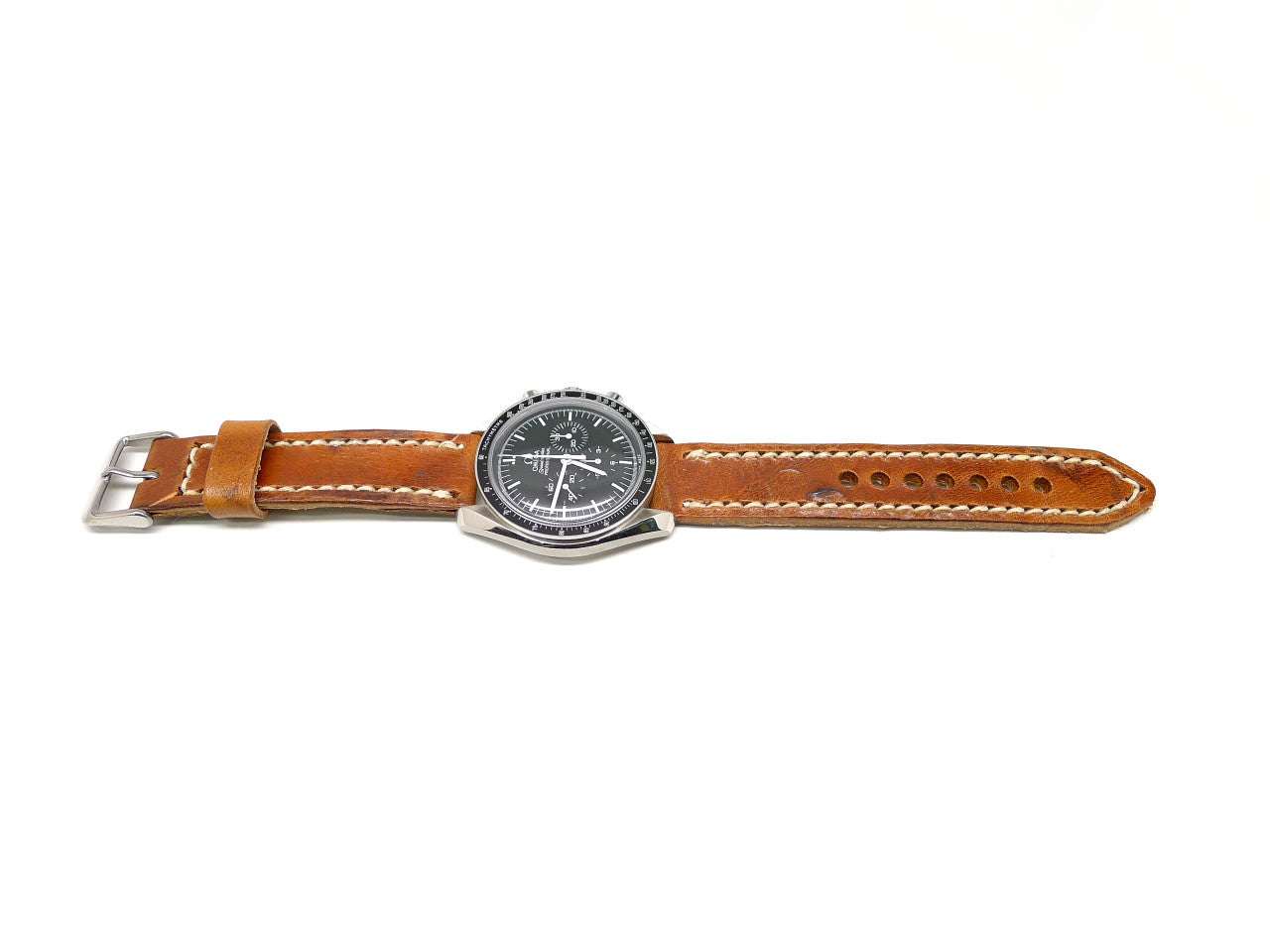 • Description: This one of a kind, individually named watch strap is handmade from some of the rarest and most sought-after vintage Swiss ammunition pouches available, that date back from the early 1900s to the late 1960s. We pair this ultra-tough military grade leather with a finely finished stainless steel buckle to create an exceptional quality watch strap that is guaranteed to enhance your watch as well as be a statement piece for your wrist. Every nuanced detail, hole, crease mark, scratch, stitching line or stamp is purposefully presented as each watch strap is truly a one of a kind limited edition masterpiece. We hand stitch every strap using the strongest wax linen thread for added durability, use precise finishing techniques and give meticulous attention to detail so each strap is built to last using only the finest materials available. Enhance your watch with this luxurious handmade vintage leather watch strap, it will give years of all-day comfort and style.