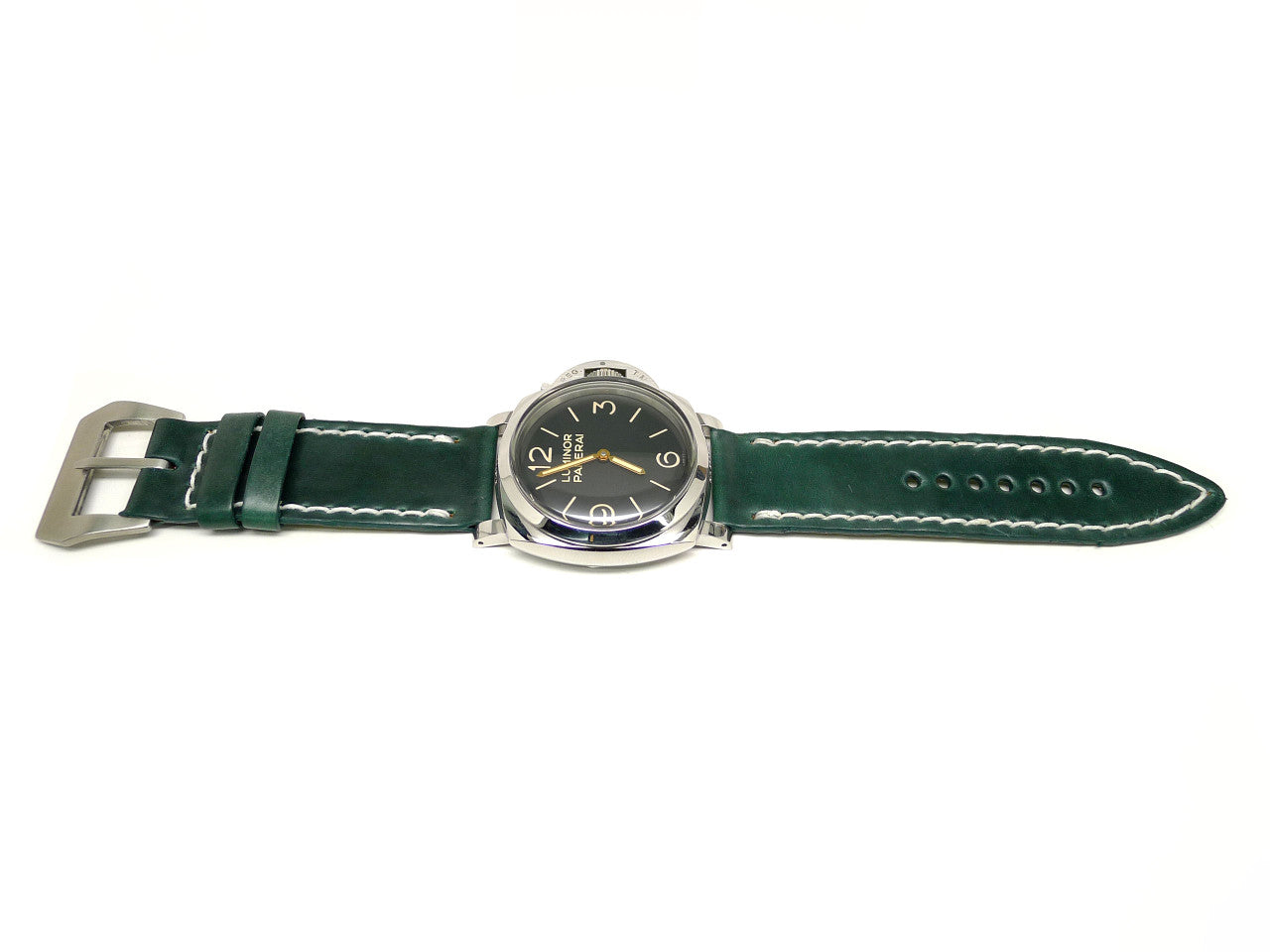 • Description: This one of a kind, individually named watch strap is handmade from genuine green Horween Shell Cordovan leather and is paired with a finely finished stainless steel buckle, that is guaranteed to enhance your watch. Shell Cordovan is the art of tanning at its finest, taking irregular oval shaped shells and tanning, stuffing, shaving, then polishing – a process taking at least six months to complete at the world famous Horween tannery in Chicago, IL. This intense process gives the leather its unique properties that make it like no other. The results yield some of the finest leather known to man. You simply cannot find better leather! That same care, quality and attention to detail is clear throughout each strap as we mirror their attention to detail in each watch strap we produce. We hand stitch every strap using the strongest wax linen thread for added durability, use precise finishing techniques and give meticulous attention to detail so each strap is built to last using only the finest materials available. Enhance your watch with this luxurious shell cordovan leather watch strap, it will give years of all-day comfort and style.