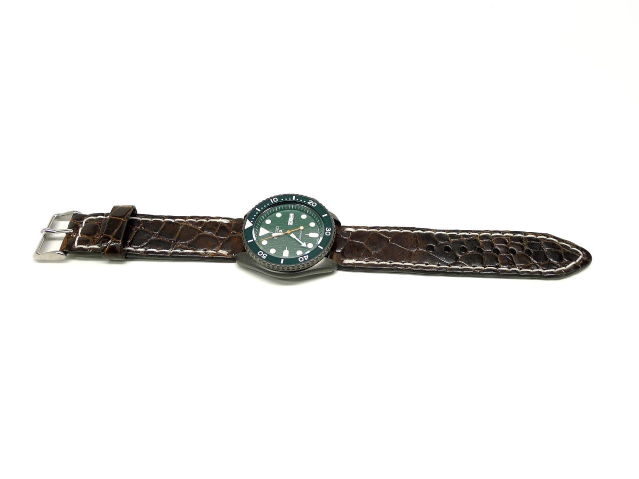 • Description: This one of a kind, individually named watch strap is handmade from some of the finest genuine alligator skins available and is paired with a finely finished stainless steel buckle, that is guaranteed to enhance your watch. We hand stitch every strap using the strongest wax linen thread for added durability, use precise finishing techniques and give meticulous attention to detail so each strap is built to last using only the finest materials available. Enhance your watch with this luxurious handmade alligator watch strap, it will give years of all-day comfort and style.