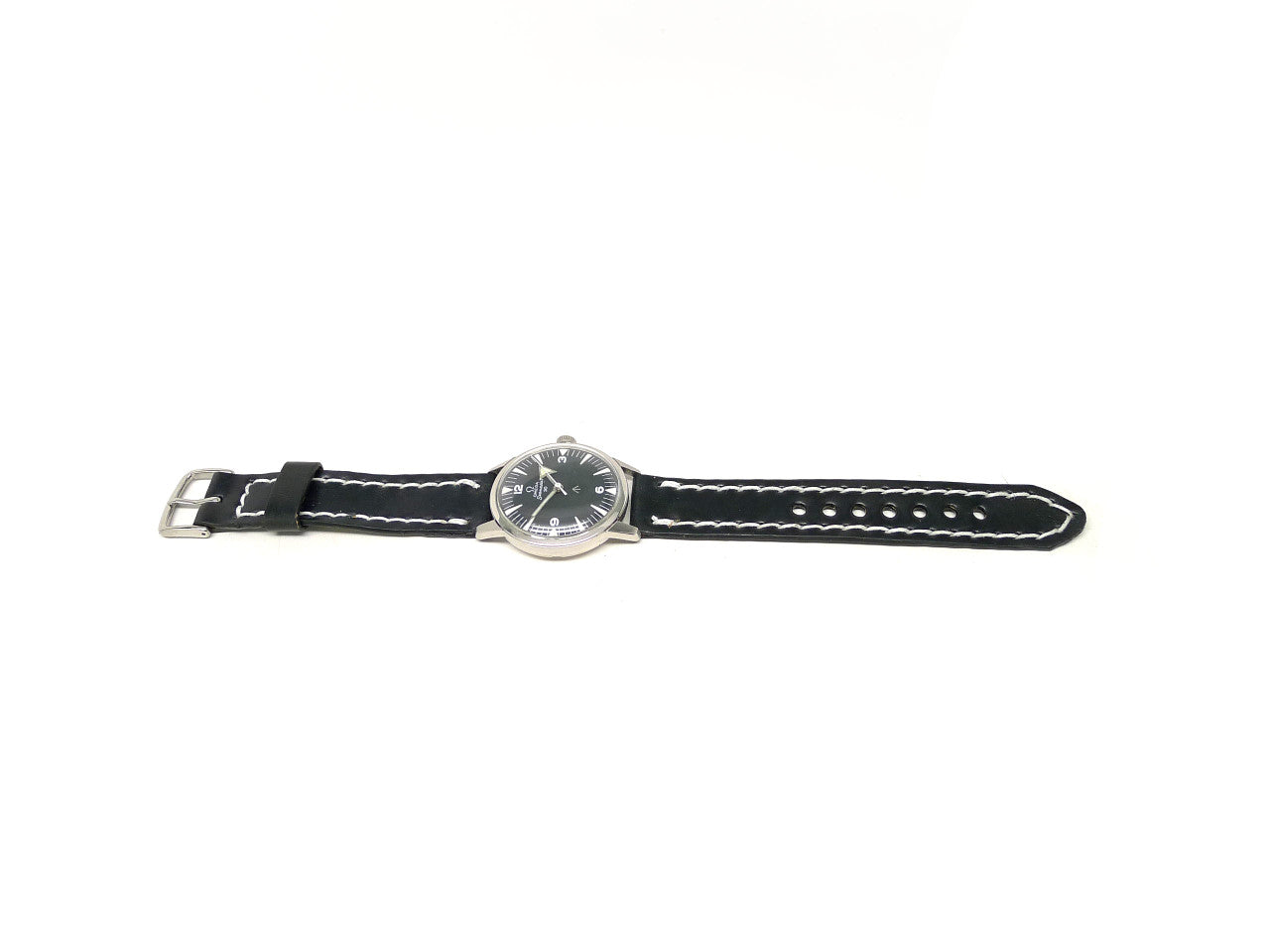• Description: This one of a kind, individually named watch strap is handmade from genuine Black Horween Shell Cordovan leather and is paired with a finely finished stainless steel buckle, that is guaranteed to enhance your watch. Shell Cordovan is the art of tanning at its finest, taking irregular oval shaped shells and tanning, stuffing, shaving, then polishing – a process taking at least six months to complete at the world famous Horween tannery in Chicago, IL. This intense process gives the leather its unique properties that make it like no other. The results yield some of the finest leather known to man. You simply cannot find better leather! That same care, quality and attention to detail is clear throughout each strap as we mirror their attention to detail in each watch strap we produce. We hand stitch every strap using the strongest wax linen thread for added durability, use precise finishing techniques and give meticulous attention to detail so each strap is built to last using only the finest materials available. Enhance your watch with this luxurious shell cordovan leather watch strap, it will give years of all-day comfort and style.