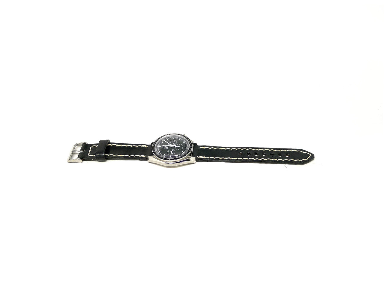 • Description: This one of a kind, individually named watch strap is handmade from genuine Black Horween Shell Cordovan leather and is paired with a finely finished stainless steel buckle, that is guaranteed to enhance your watch. Shell Cordovan is the art of tanning at its finest, taking irregular oval shaped shells and tanning, stuffing, shaving, then polishing – a process taking at least six months to complete at the world famous Horween tannery in Chicago, IL. This intense process gives the leather its unique properties that make it like no other. The results yield some of the finest leather known to man. You simply cannot find better leather! That same care, quality and attention to detail is clear throughout each strap as we mirror their attention to detail in each watch strap we produce. We hand stitch every strap using the strongest wax linen thread for added durability, use precise finishing techniques and give meticulous attention to detail so each strap is built to last using only the finest materials available. Enhance your watch with this luxurious shell cordovan leather watch strap, it will give years of all-day comfort and style.